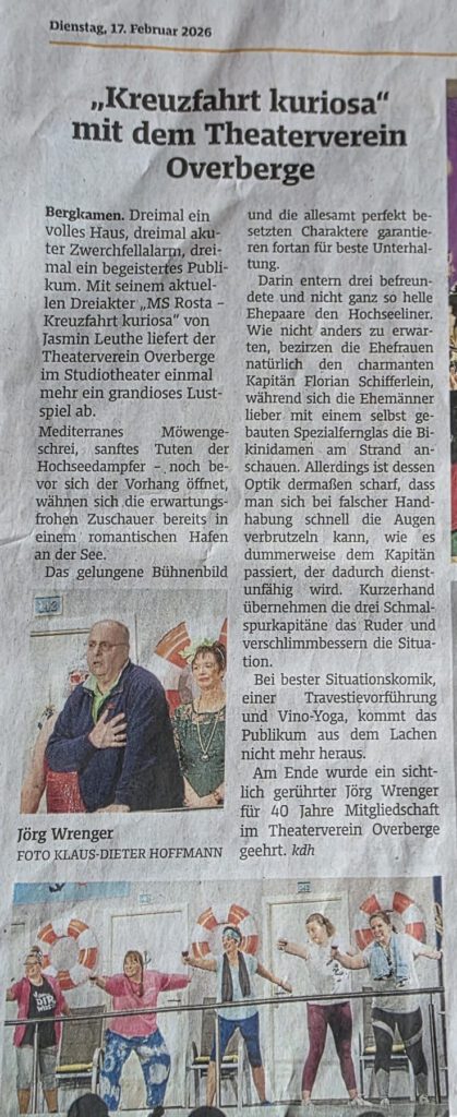 Der Theaterverein Overberge blickt nach 3 nahezu ausverkauften Vorstellungen auf eine erfolgreiche Saison 2024/2025 zurück. Wir haben wie immer viel Spaß bei den Proben gehabt und freuen uns nach einer wohl verdienten Sommerpause schon jetzt auf das nächste Stück. Seien Sie gespannt.