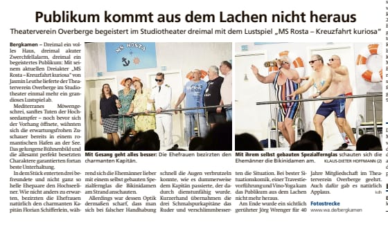 Der Titel ist Programm dachte sich auch der Theaterverein Overberge beim diesjährigen Stück „Wellness, Witwen und heiße Wünsche“ von Jasmin Leuthe. Denn schon bei den Proben fiel auf, dass das Stück doch eher kurzweilig war und selbst mit den üblichen Zusätzen, die der Theaterverein als eigenes Markenzeichen immer gerne einbaut, es doch deutlich kürzer war als die Stücke davor.