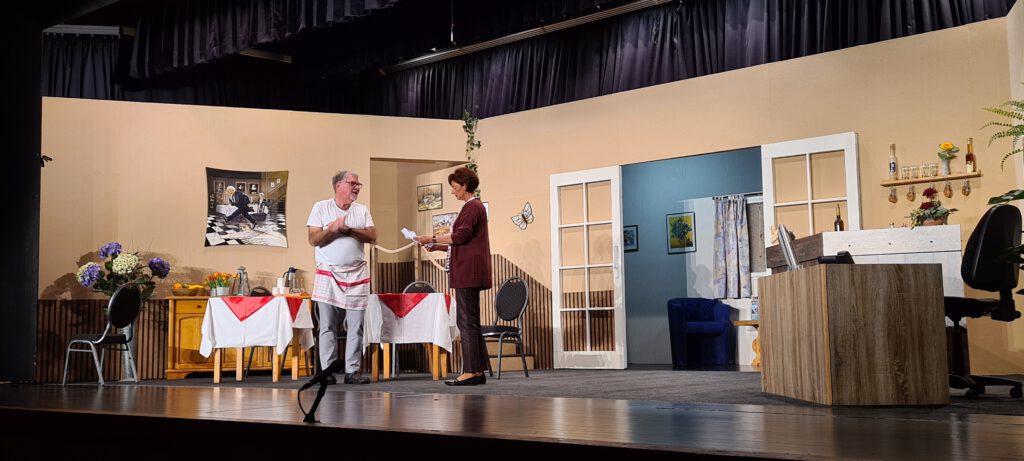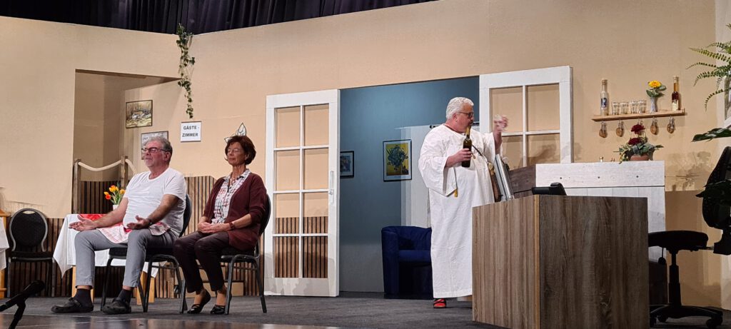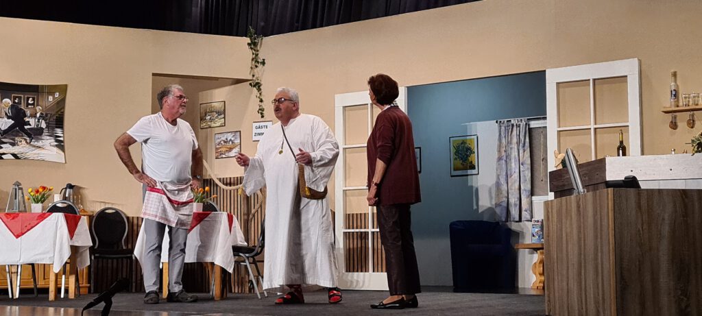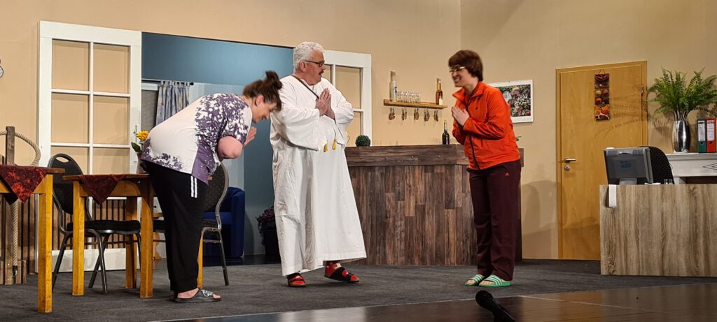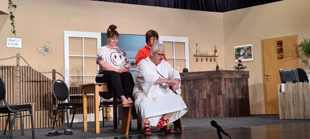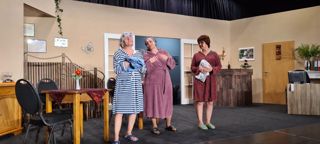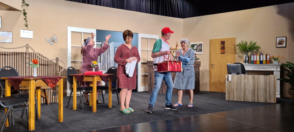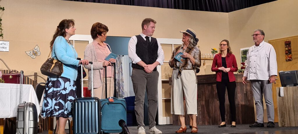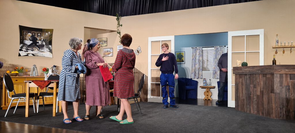 Bernd meldete sich dann bei der Hotelbesitzerin noch mit dem Hinweis ab, dass sie hier Leute sitzen hätte und so konnte das Stück dann beginnen. Helene gespielt von Heike Blaschke hatte ein wenig Geldsorgen, weil ein Hotel in der Nähe aufgemacht hatte und ihr die Gäste wegschnappte. Also schaltet sie kurzer Hand eine Anzeige für einen Wellness Urlaub unter tatkräftiger Hilfe ihrer Angestellten Rita (Andrea Nierobisch), die nun zahlungskräftige Gäste locken sollte und gleichzeitig bei geringem Umgestaltungsaufwand der Zimmer, viel Geld in die Kassen spülen sollte. Schließlich hatte sie ja schon einmal Städter mit Kühen kuscheln lassen und auch das war damals schon sehr lukrativ. Gesagt getan und Rita’s Freund Hannes (Marvin Müller) zauberte auch noch die entsprechenden Menüvorschläge dazu, naja sagen wir er gab einfachen Gerichten mittels kreativer Namensgebung ein neues Gewand. Helenes Mann Paul gespielt von Michael Herberholz, war zwar ein guter Koch, aber kein Geschäftsmann. Helene war begeistert und voller Tatendrang.